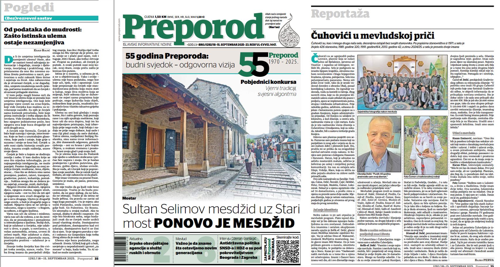 Naša prošlost nas je učila izdržljivosti i skromnosti; naša sadašnjost zahtijeva odgovornost i institucionalnu koheziju; naša budućnost ovisi o spremnosti da promijenimo sebe kako bismo promijenili stanje u kojem živimo. Preporod je u proteklih pedeset i pet godina bio budni svjedok ali i prostor samorefleksije i promjene. Taj zavjet nastavljamo i danas: misliti odgovorno u vremenu brzih sudova, njegovati mjeru i staloženost jezika u epohi galame, čuvati dostojanstvo i širiti prostor razuma. Male zajednice opstaju kvalitetom svojih institucija i sposobnošću da uspostave odgovornu transformaciju za novo doba; zato i Preporod, kao dio Islamske zajednice u Bosni i Hercegovini, mora ostati odgovorna vizija koja se ne iscrpljuje u opisivanju svijeta, nego ga i tumači i preusmjerava prema općem dobru.